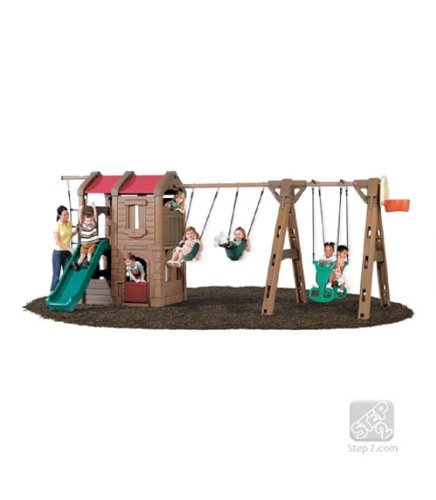 mode : Step2 Adventure Lodge Swingset Clubhouse Play Center with Glider and Bonus Sand Box. This Giant Play Center Functions As a Playhouse, Climber, and Jungle Gym All in One Product. This Durable Unit Includes a Slide, Rope Ladder, Climbing Wall, Glider and Basketball Hoop. This Backyard Activity Center Promotes Active Outdoor Play and Sparks Imaginative Play with Two Stories of Climbing and Hiding in the Playhouse.